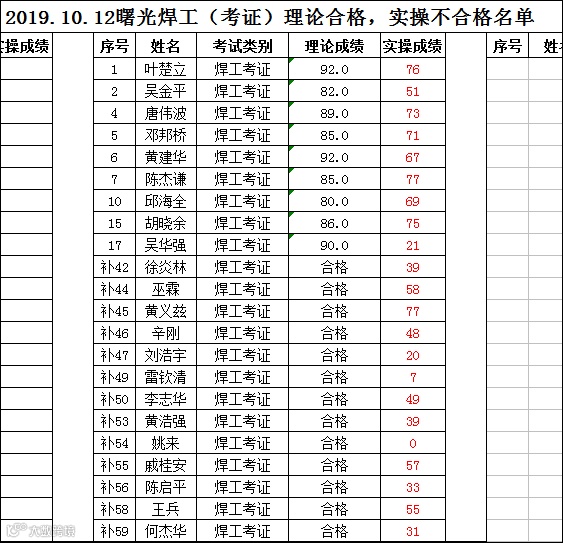 2019.10.12曙光焊工(考证)考试理论合格,实操不合格名单