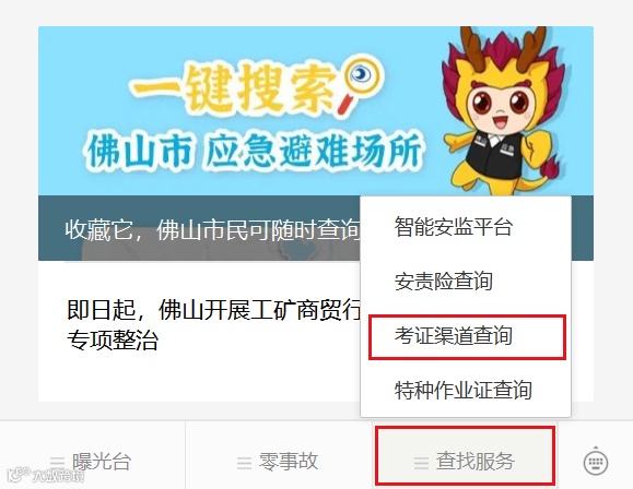全市安全生产培训机构、考试点最新信息可关注“佛山应急管理”微信公众号,点击菜单栏【查找服务】-【考证渠道查询】获取。