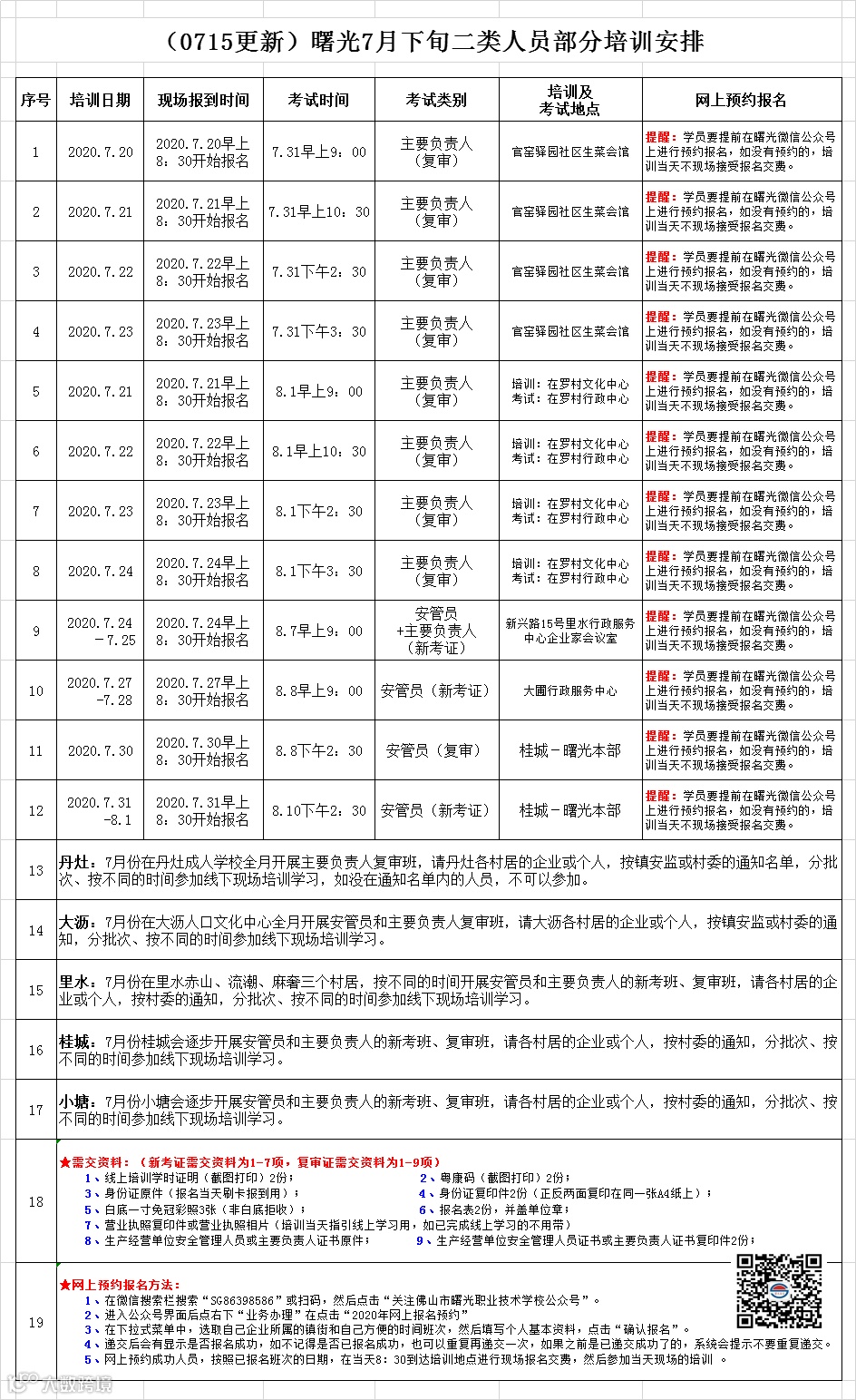 今年各镇街的培训安排,大部分都是先安排复审培训开班,然后再安排新考证培训开班, 我校7月下旬二类人员部分开班信息如下,请有需要的企业按辖区通知要求,分片区按不同的时间进行小班制培训,我校会严格按照市局的培训要求,“测体温、亮行程、戴口罩、分开坐、控人数”的原则进行: