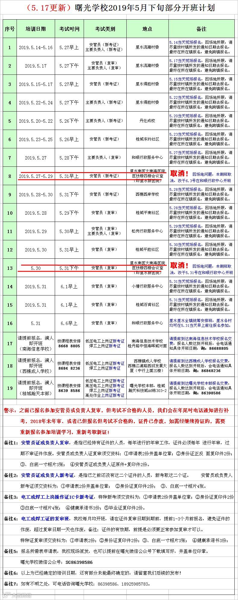 1、原定5.27号在里水南医大南海医院医技楼四楼(即里水新医院)开班的安管员新考证班取消,改期于6.3在和顺行政中心进行。