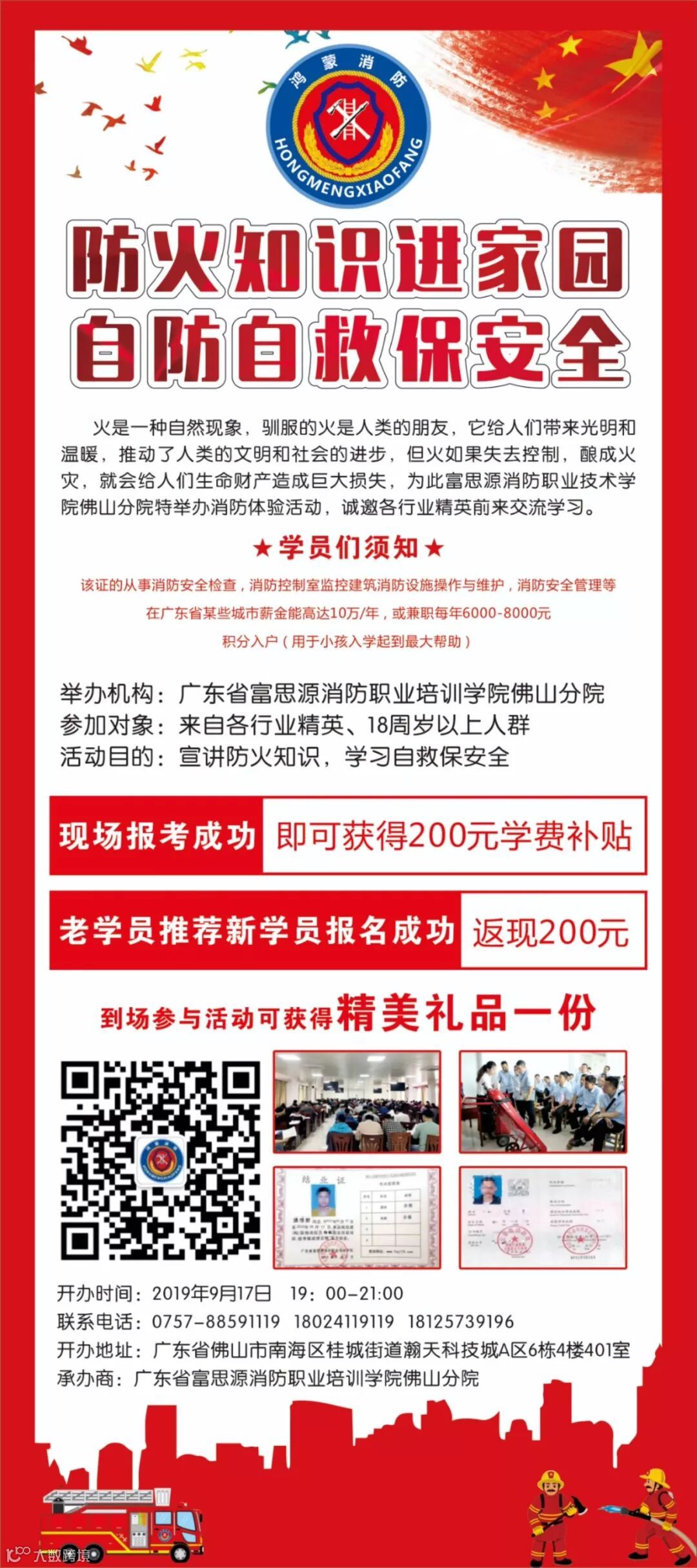 广东富思源消防职业培训学院佛山瀚天分院于2019年9月17日19:00-21:00办“自防自救保安全”免费公益课活动,活动您可以更加深入了解消防知识,让您知道火灾不仅仅只是逃生与灭火器的使用,还有更多的知识与技巧。
