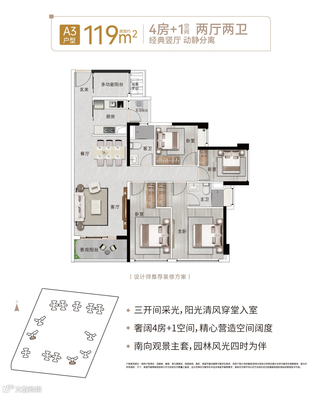 建面约119㎡的4房+1空间,以竖厅为核心,约10米南向三开间,南向奢阔主套,配步入式衣帽间,动静分区互不干扰。