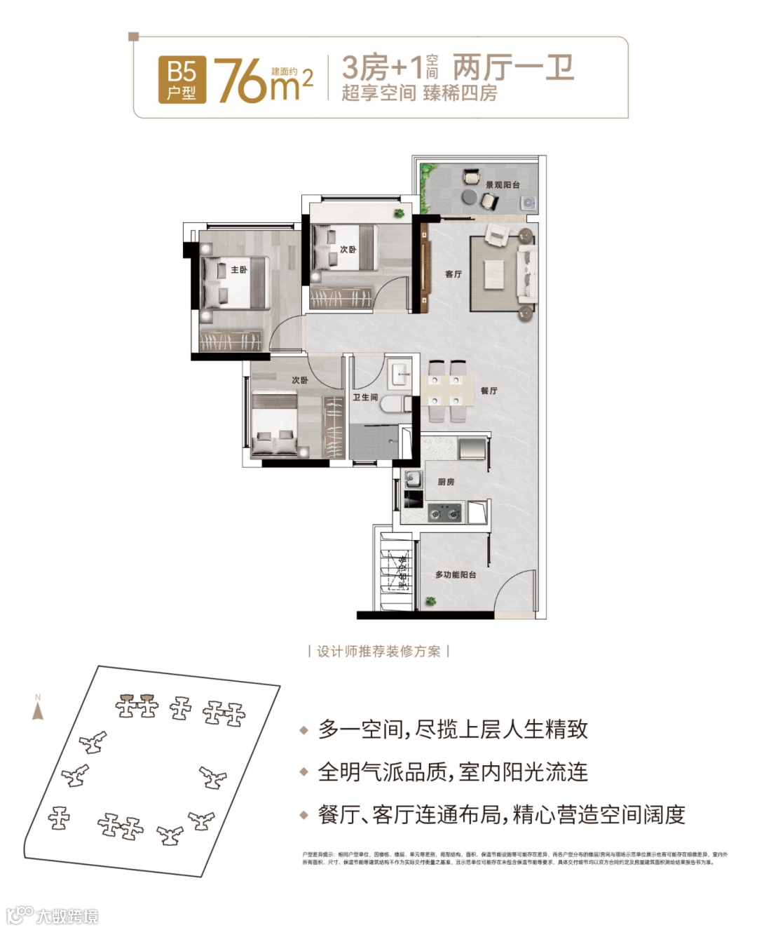 建面约76㎡3房+1空间,拥有观景阳台让孩子在自然氛围中学习、放松双眼;+1 可变空间能切换为书房或休闲区;三面采光保障孩子学习环境明亮护眼;客餐无界方便亲子互动和孩子社交。