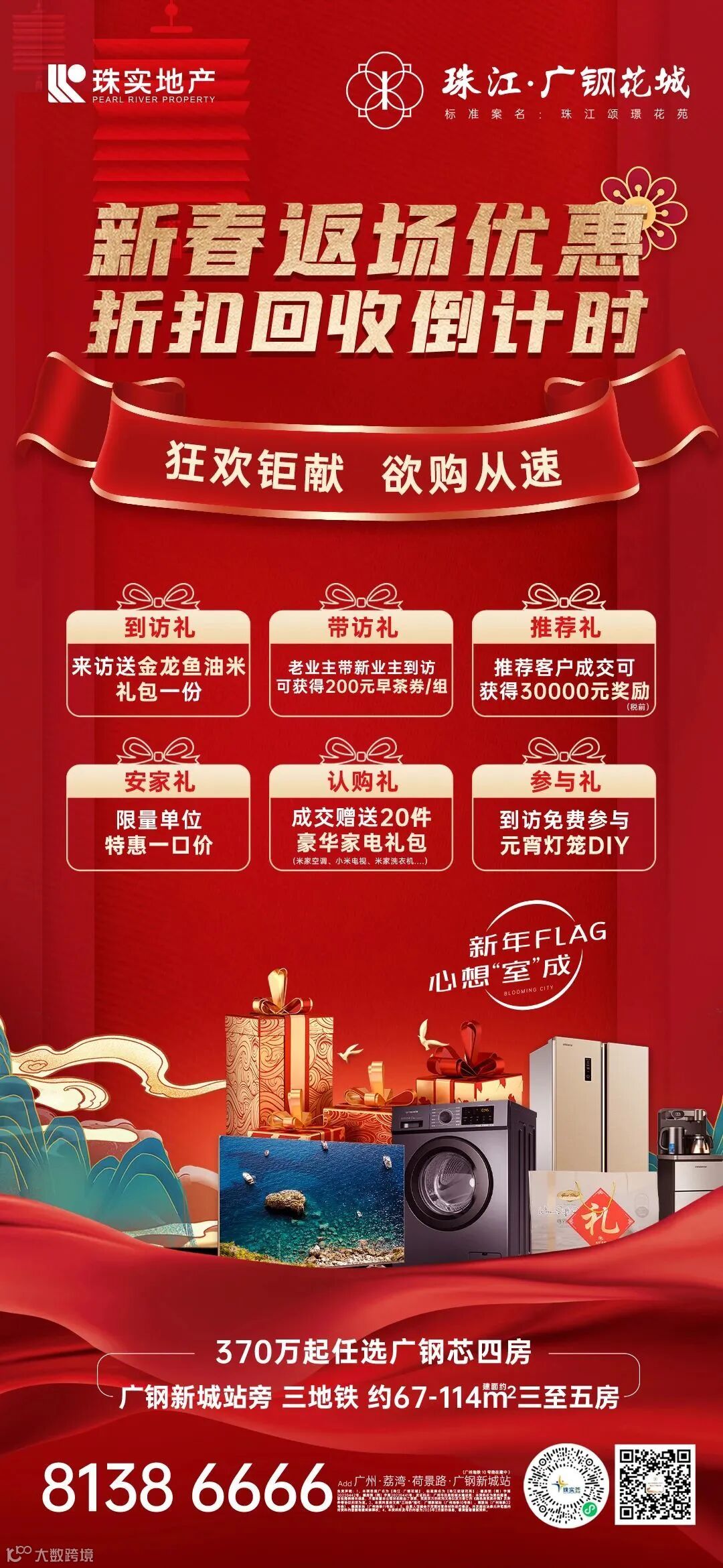 纵观此次春节假期,营销中心每天来访的客户络绎不绝,喜报频传,热度依旧不减!在如此高涨的购房热情背后,正是对珠江·广钢花城的肯定!为回馈广大客户的对项目的支持与厚爱,珠江·广钢花城新春钜惠热势返场,五重豪礼钜献,寻找开年锦鲤!