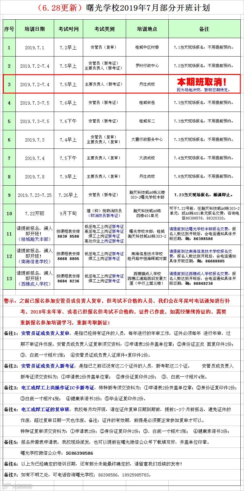 另外,原定于7.2-7.5在丹灶成校开办的主要负责人新考证班,因为场地临时有其他安排无法协调原因,需要临取消,新的开班日期待定,请留意我校后续的发布更新,请互相知悉,造成不便,敬请谅解!