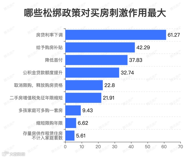 对于“哪些政策对买房刺激作用最大”这个问题,超60%比较关注房贷利率下调。给予购房补贴、降低首付需求这需求类侧政策,受到的关注度也较高。