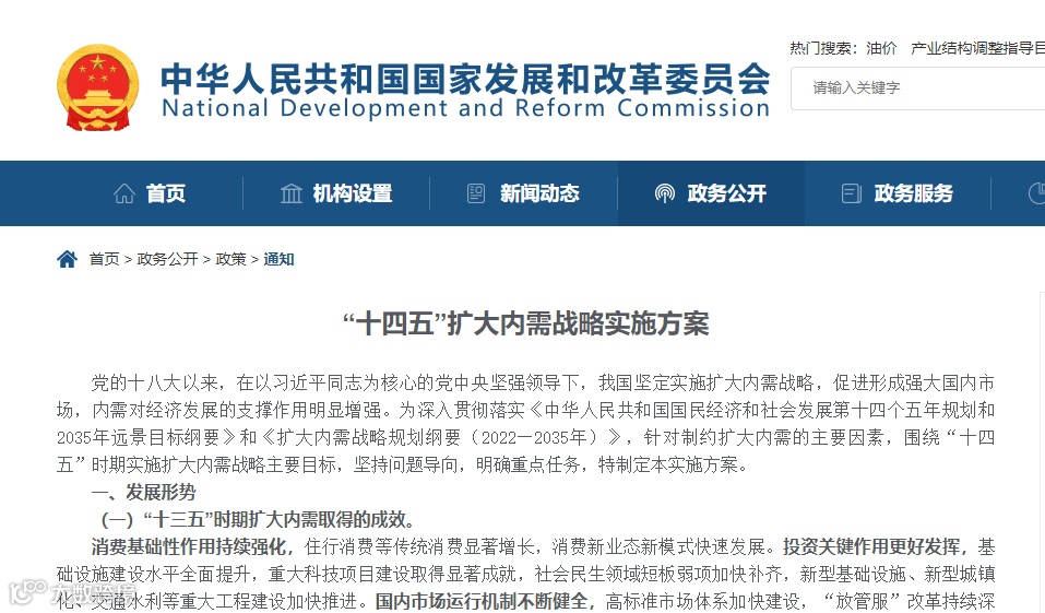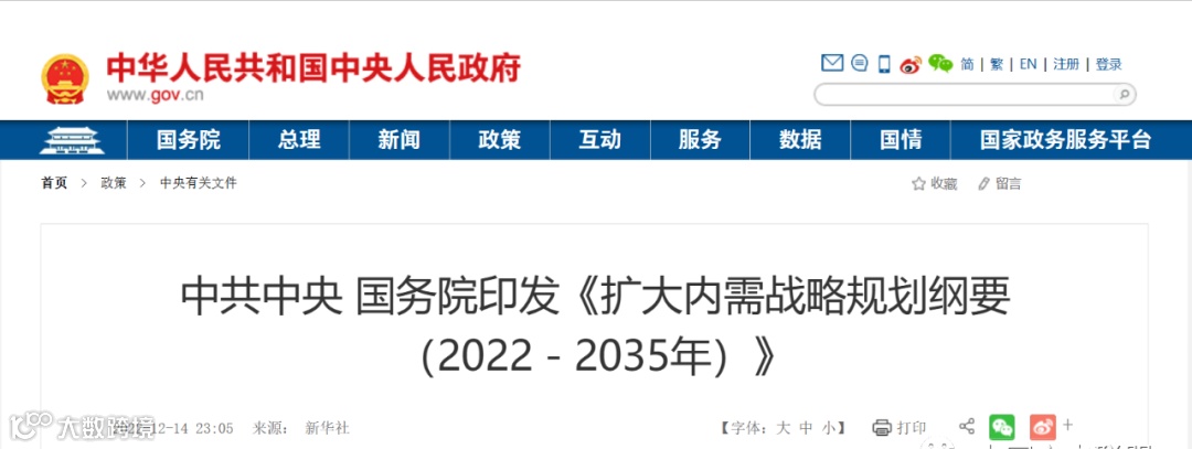 2022年12月,国家层面出台了《扩大内需战略规划纲要(2022-2035年)》和《“十四五”扩大内需战略实施方案》。