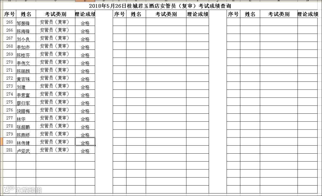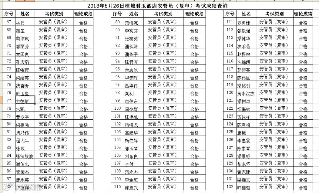 2018.05.26桂城君玉酒店安管员(复审)考试成绩查询