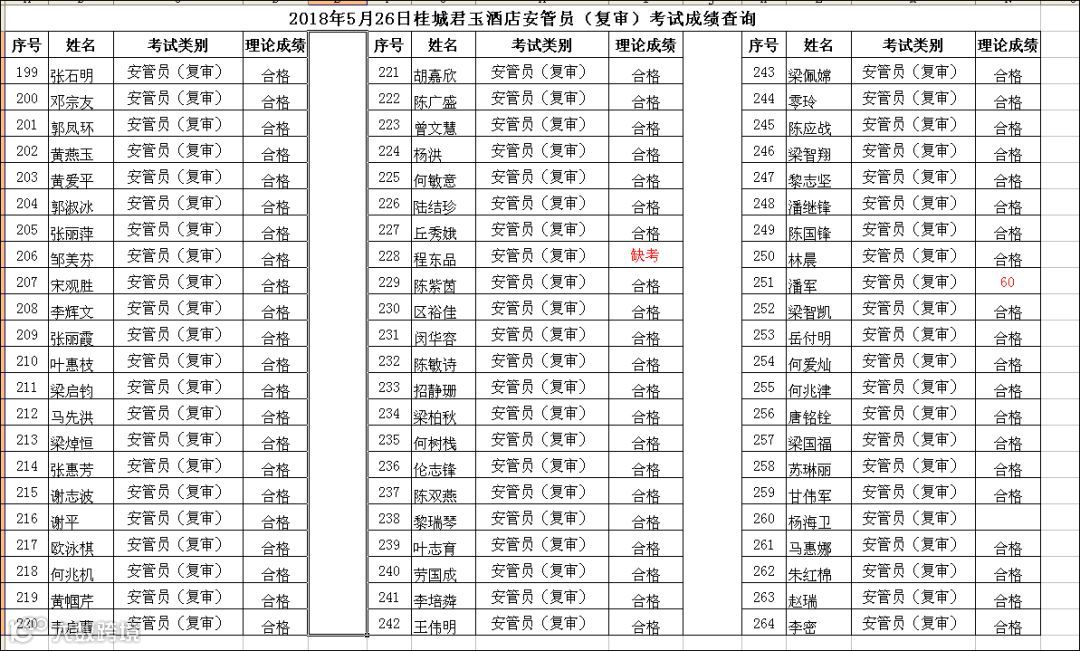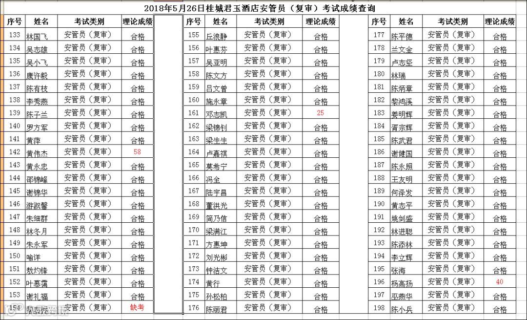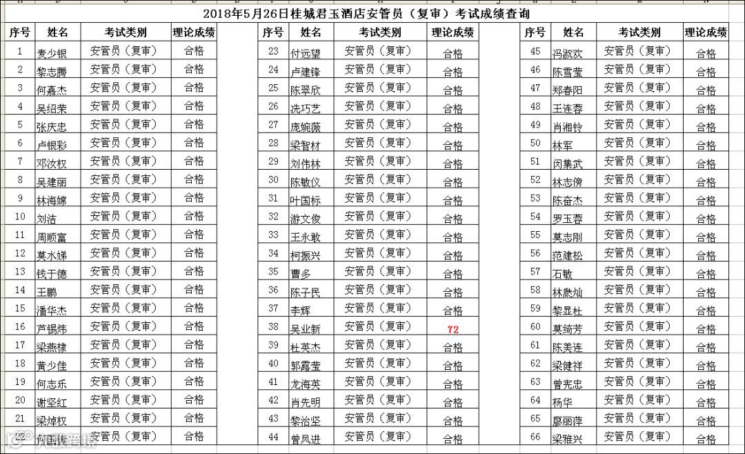 导读:2018.05.26桂城君玉酒店安管员(复审)考试成绩查询