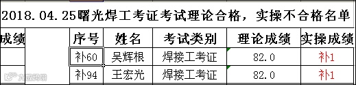 2018.04.25曙光焊工(考证)考试理论合格,实操不合格名单