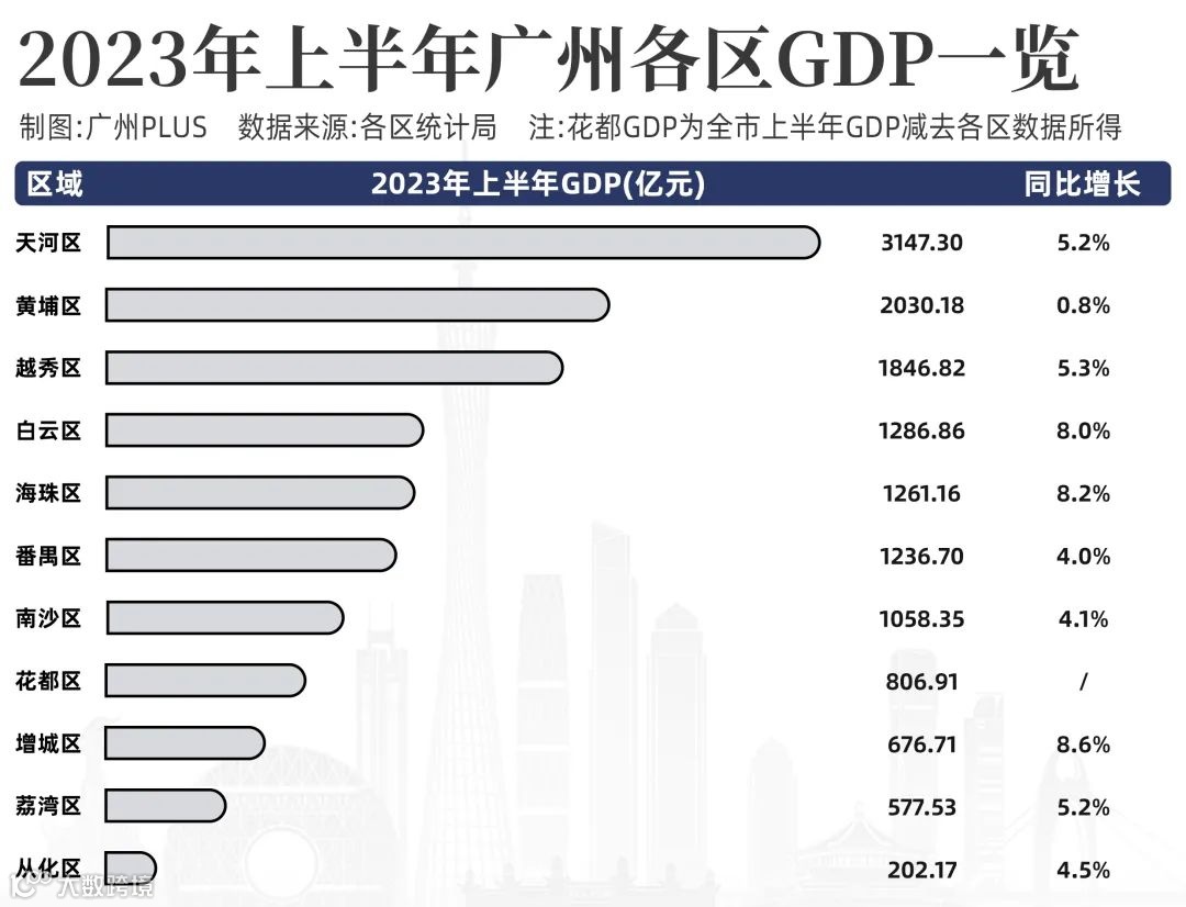 今年前三季度,广州市生产总值为21769.84亿元,同步增长4.2%。天河区首次跨越3000亿的大关,同时也是全市唯一一个半年GDP破了3000亿的区域。天河还是那个天河,断层式的遥遥领先。(信息来源:广州PLUS)