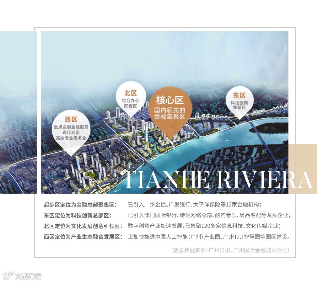 而占据广州万亿中轴线的金融城则是占据核芯的位置,金融城作为广深港澳科技创新走廊,涵盖金融、科技创新、文化发展创意、产业生态融合4大功能区,西区正加快推进中国人工智能(广州)产业园、广州T.I.T智慧园等园区建设,集合了琶洲、珠江新城的产业精髓,可谓“左手金融,右手科技”。