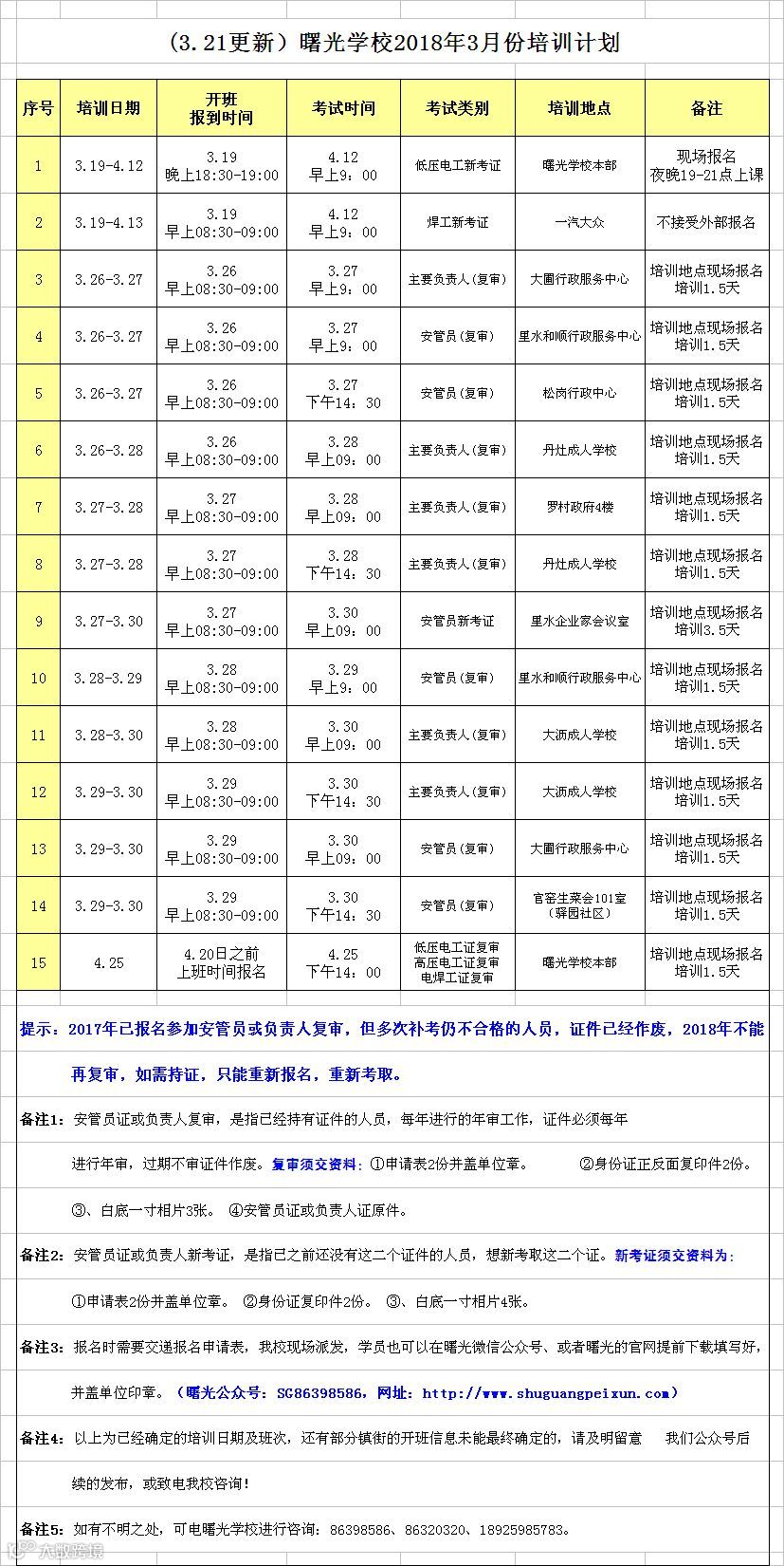 以下为已经确定的最新及最终3月份的培训班日期及班次,还有部分镇街的开班信息未能最终确定的,请及时留意我们公众号后续的发布!也可向单位所在村居或安监部门咨询、或致电我校进行咨询: