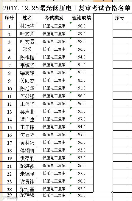 2017.12.25曙光低压电工(复审)考试合格名单