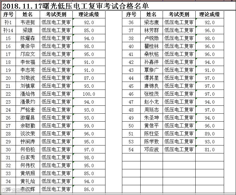 导读:2018.11.17曙光学校低压电工(复审)考试合格名单