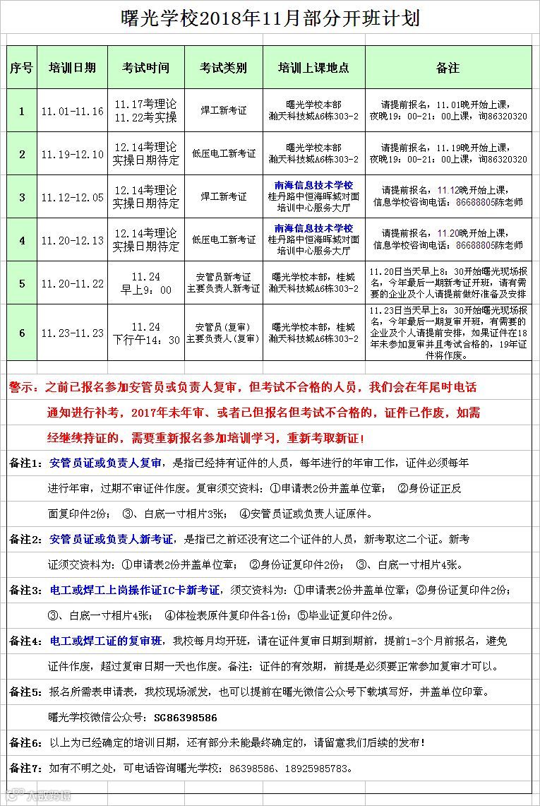备注:如果负责人证或安管员证件在2018年未进行复审培训并且考试合格的,证件在2019年将作废无效,曙光学校在11月部分开班信息如下: