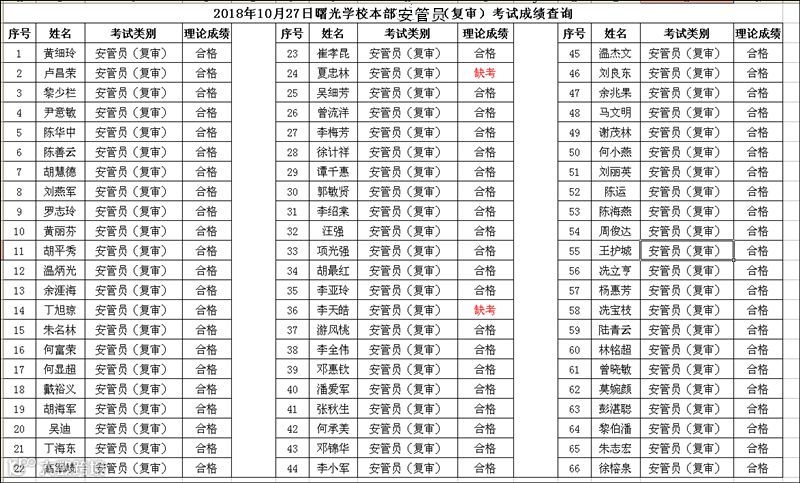 导读:2018.10.27曙光学校本部安管员(复审)考试成绩查询