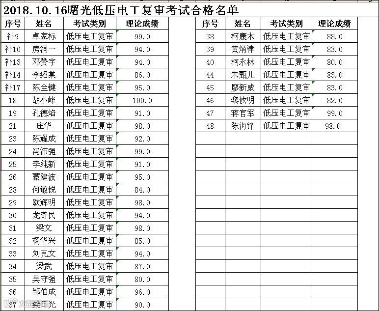 2018.10.16曙光低压电工(复审)考试合格名单