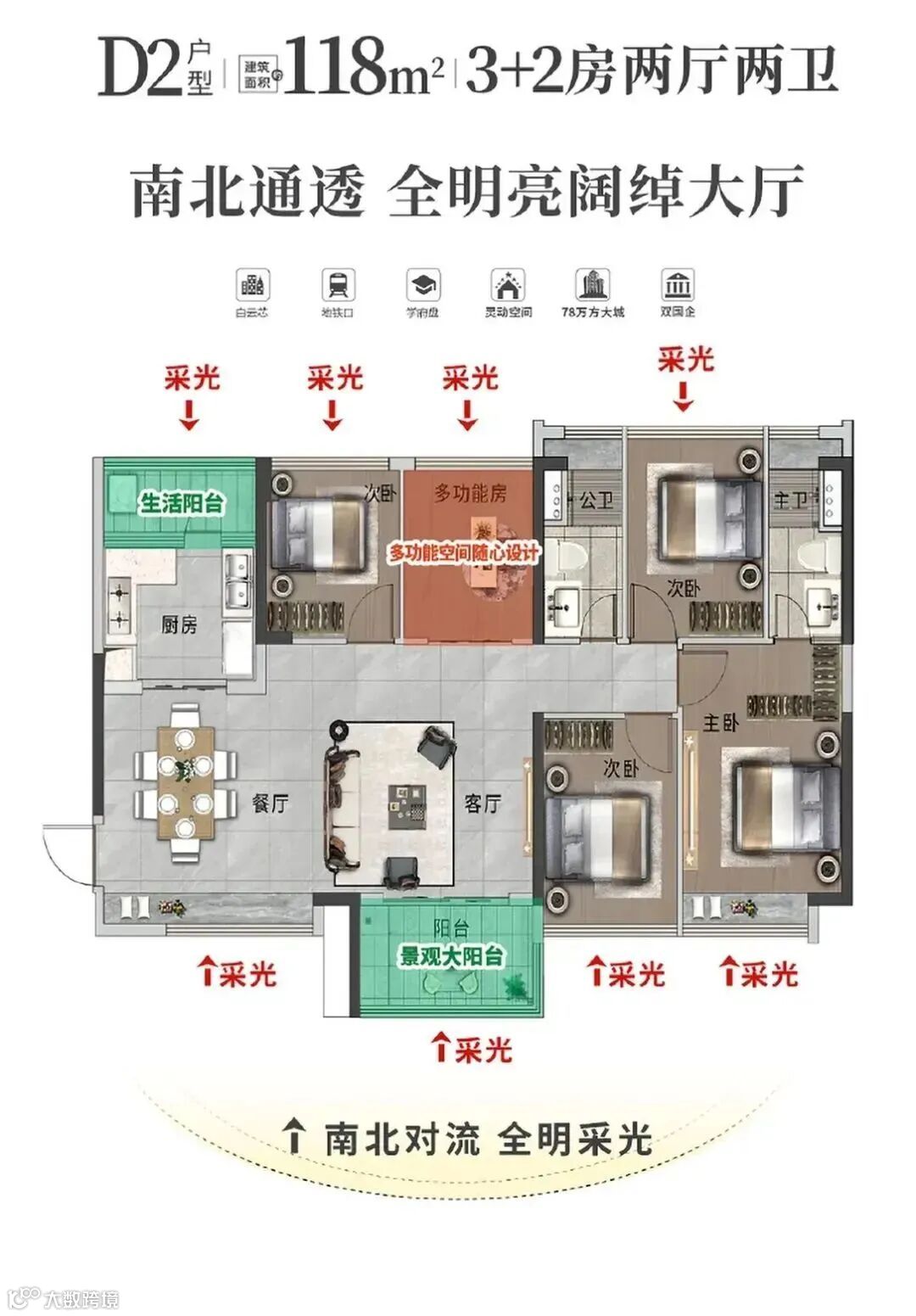 建面约118㎡的五房,不仅做到了五房设计,更拥有奢适的主套配置。