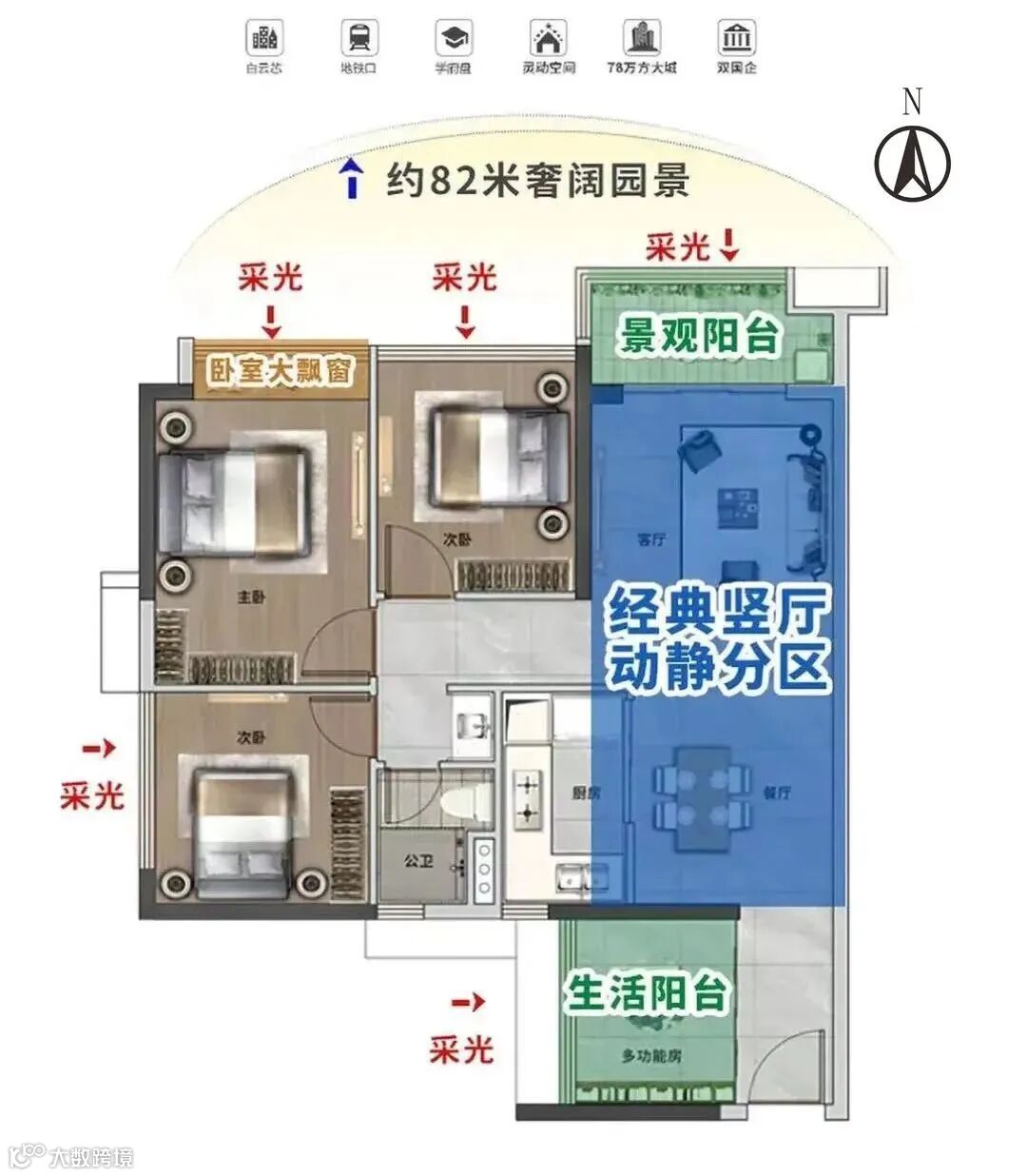 约6.3米宽阔大阳台,收纳阳光与园景,单边位格局,更享方正实用。