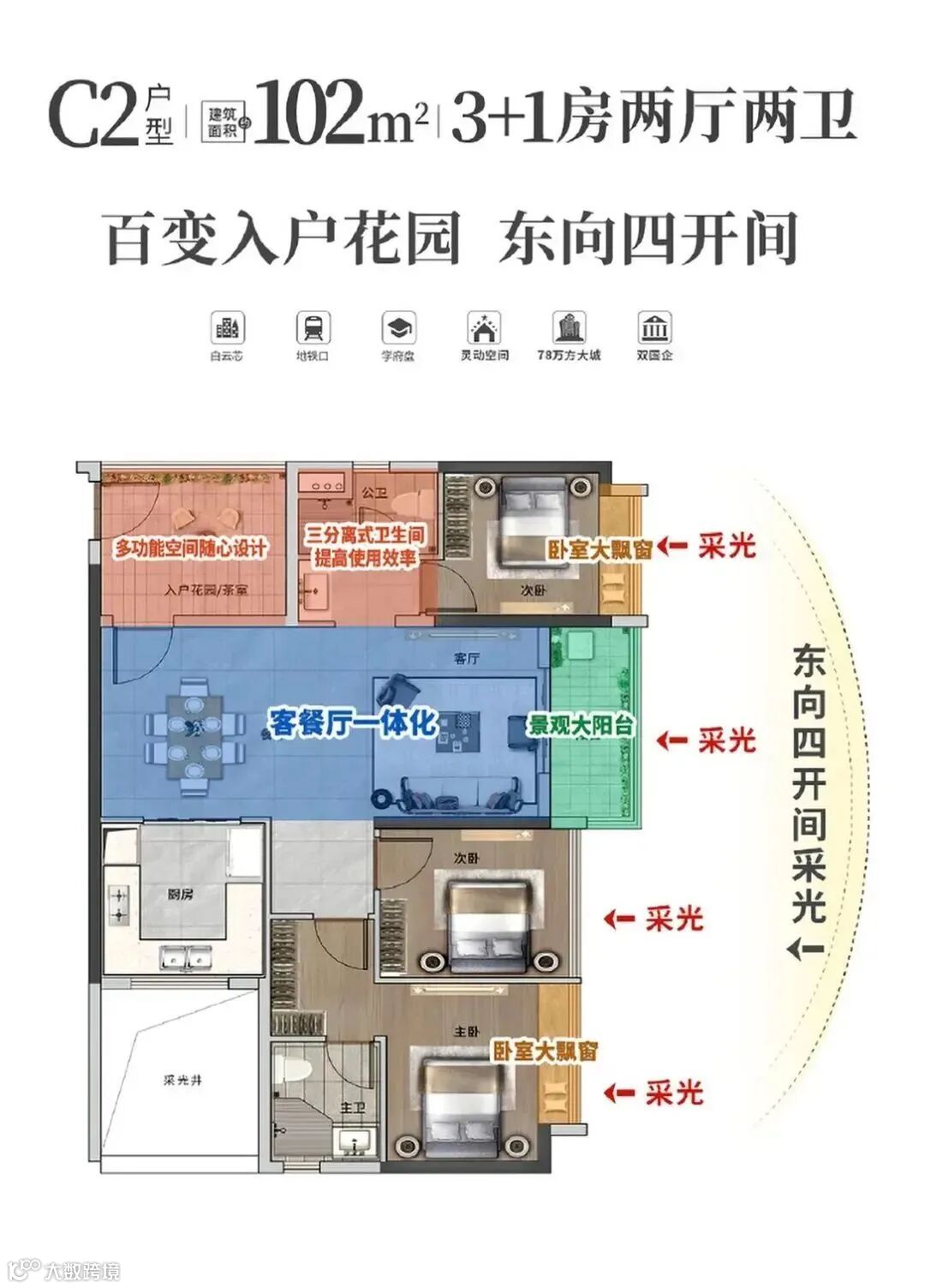 建面约102㎡的四房,拥有着东向四开间宽敞采光,尊享阳光与健康。