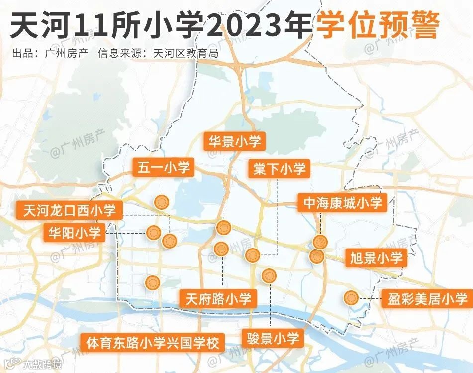 2021年,广州市天河区教育局对龙口西小学、天府路小学、体育东路小学兴国学校、旭景小学、华阳小学等5所学校2022年起的招生做出预警提示。今年4月,天河区教育局又对11所小学2023年的学位进行预警。