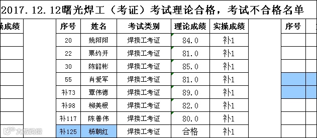 2017.12.12曙光学校焊工(新考证)理论成绩合格,实操成绩不合格名单