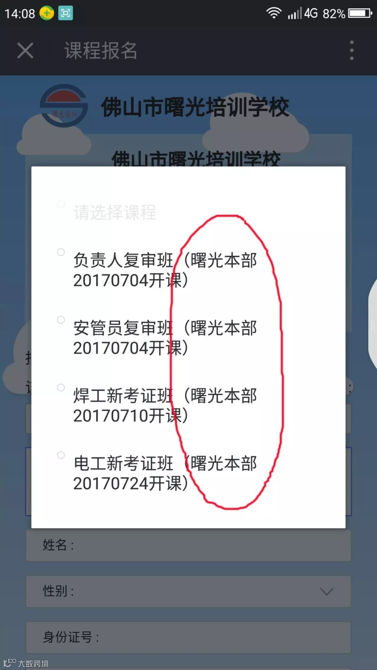 4、在弹的对话框处选择你想参加培训学习的班次(需注意的是,可能考证或复审有多个班次,请选择离你近的上课地点班次报名):