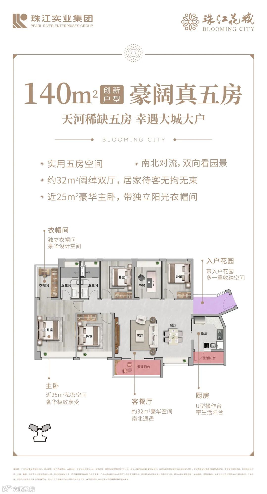 建面约140平的5房2厅2卫产品,则非常适合未来的三孩家庭。南北对流,南向约16米大面宽造就的大横厅+宽景阳台、多开间朝南,让阳光与清风充斥在全屋的每个角落;主卧套间面积达到25平,是女主人绝对的心头爱,再多漂亮衣服都能一一得到收纳。