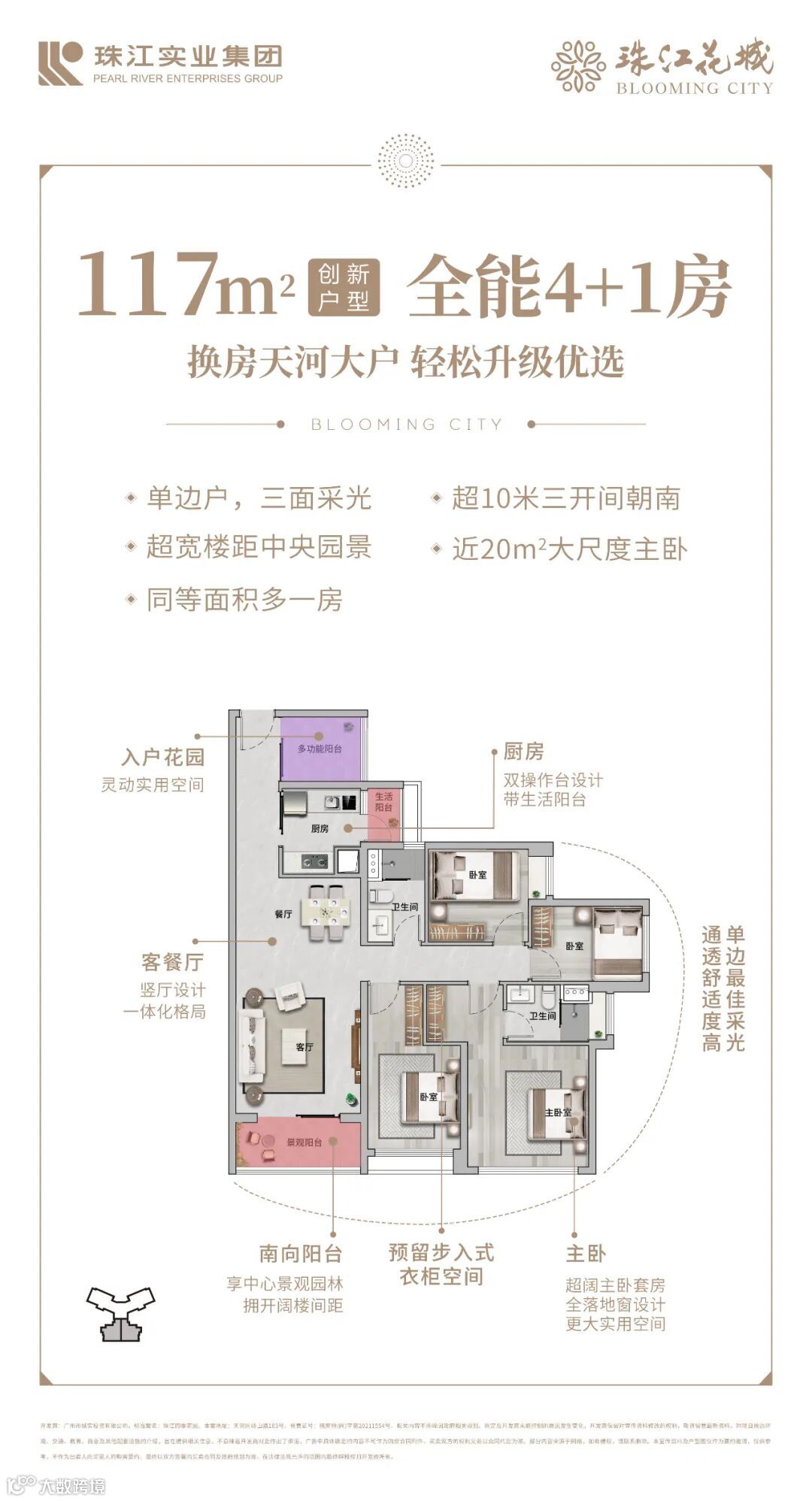 例如,建面约117平“4+1”房2卫,用3房的面积做可变5房,三开间朝南、套房主卧等设计打造出媲美传统的140平户型的空间体验感。