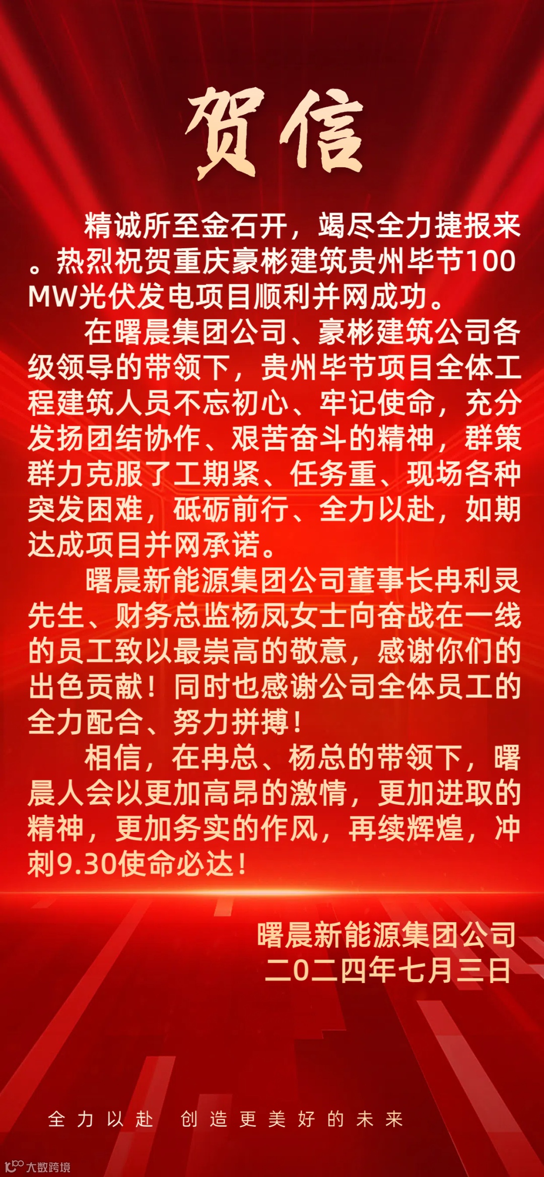 贺信 | 热烈祝贺重庆豪彬建筑贵州毕节100MW光伏发电项目并网成功