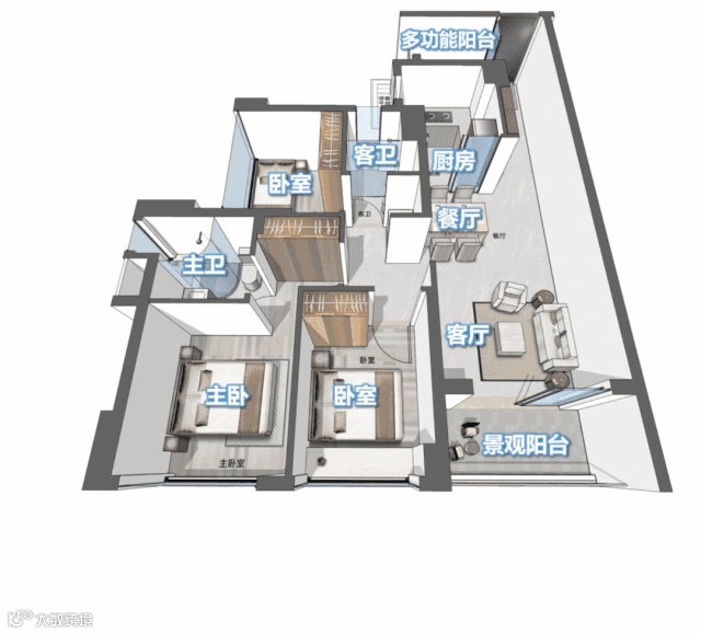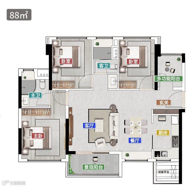 建面约88m²竖厅3+1房,同等面积超享空间,进深约6m客厅搭配景观阳台,最大限度成全采光效果,尽享百米楼距带来的阳光与新鲜空气,是主城90m²以下难得的三开间采光户型。