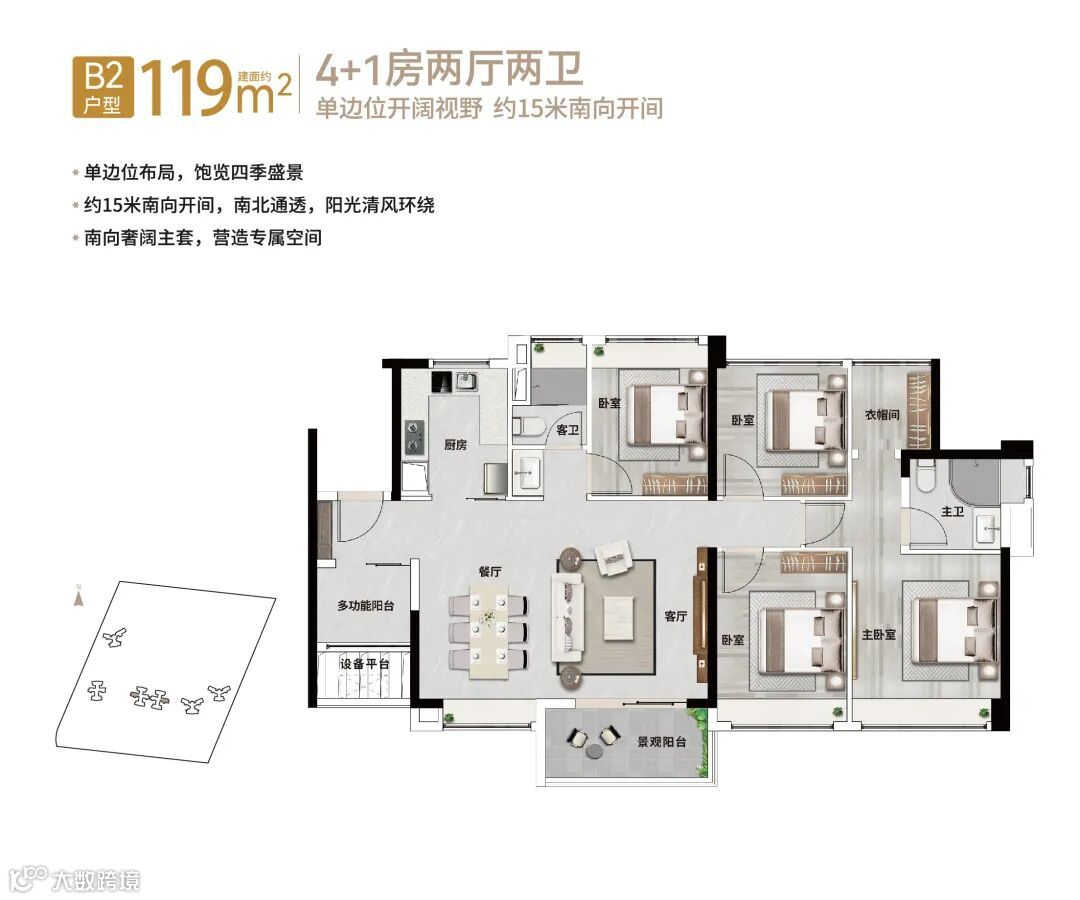 建面约119m²4+1房以市面上三房面积实现五房体验。单边位布局,三开间朝南,实现采光与清风入户的最优化,满眼皆是社区园林盛景。