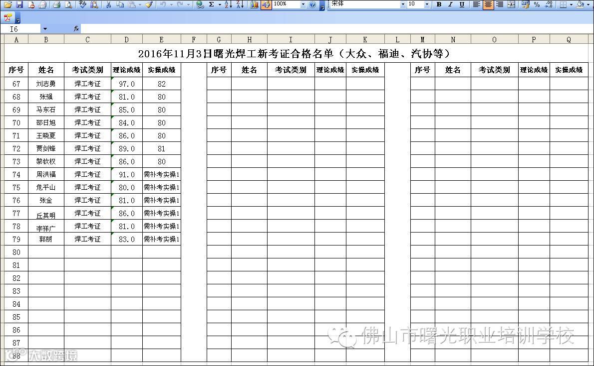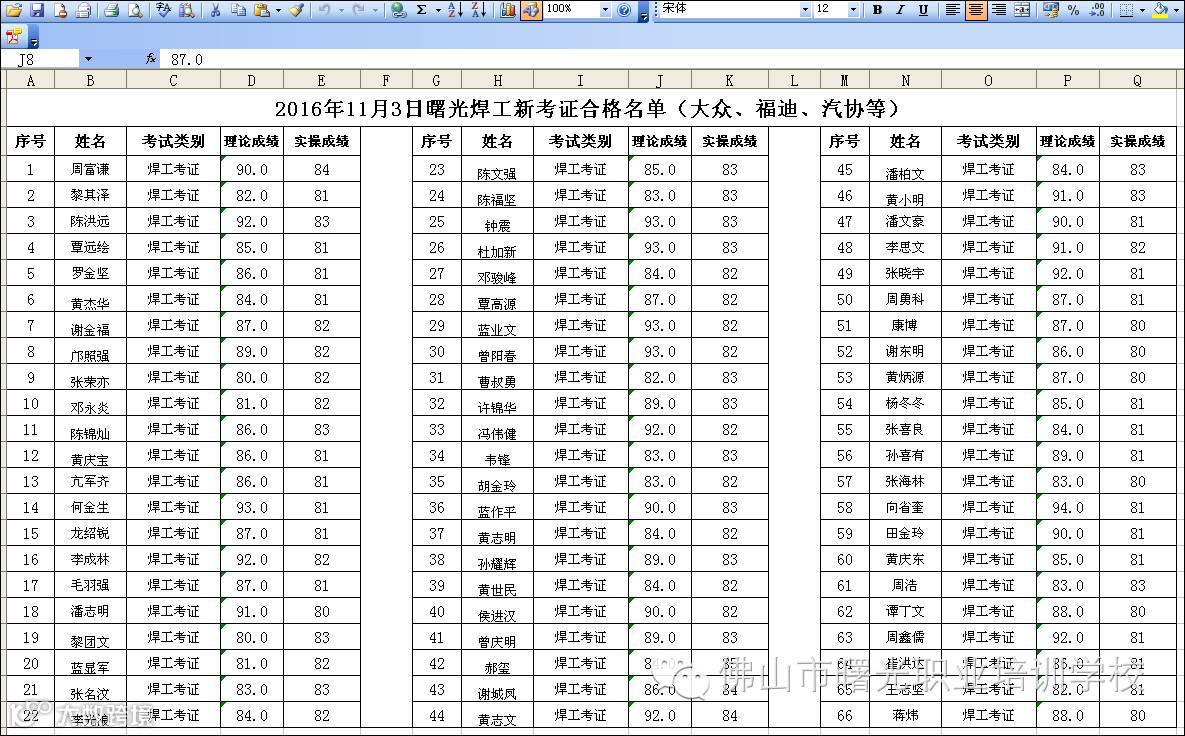 2016.11.03曙光焊工新考证考试合格名单 佛山市曙安安全技术服务公司