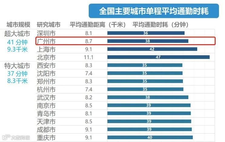 最近的广州,因为“挤”和“堵”热度攀升。在一份《全国主要城市通勤时耗监测报告》中还计算了全国36个重点城市的单程平均通勤时耗。其中广州作为超大城市,平均通勤时耗为38分钟,平均通勤距离8.7千米。