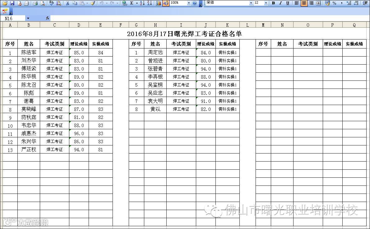 2016.8.17曙光学校焊工考证合格名单(补考班) 佛山市曙安安全技术服务公司