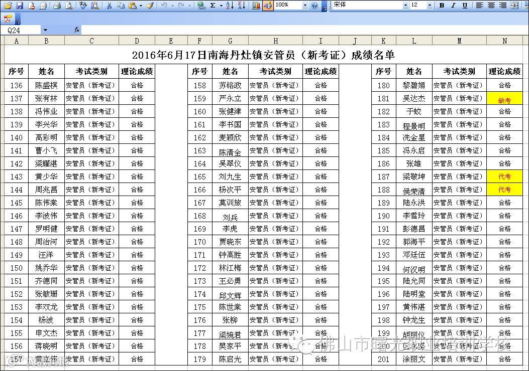2016.6.17南海丹灶镇政府考场安管员新考证成绩名单