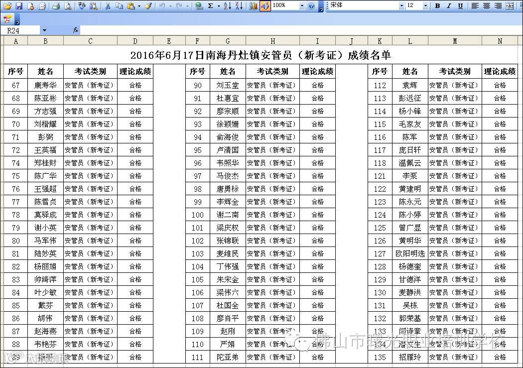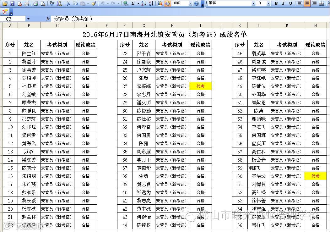 2016.6.17南海丹灶镇政府考场安管员新考证成绩名单 佛山市曙安安全技术服务公司