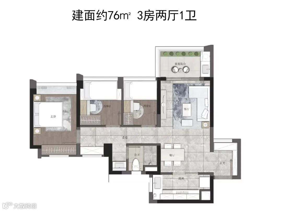 以约69㎡空间打造三房两厅一卫格局,比较市场同等面积户型多一房,凭借超高实用率,完胜市场其他同面积户型。