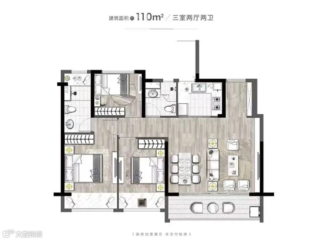 这个户型在控制总价的同时,功能性和舒适性实现了更大程度的突破,丝毫不亚于周边110㎡户型的居住体验感。