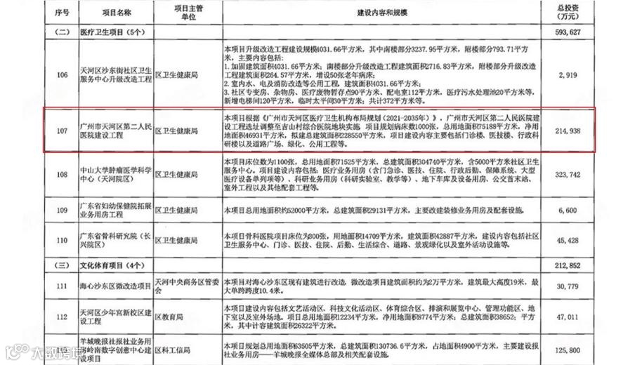 2022年2月,天河政府发布《2022年天河区重点建设项目计划的通知》中提及,三甲医院——天河区第二人民医院作为上榜项目,将会在珠江花城旁规划建设。