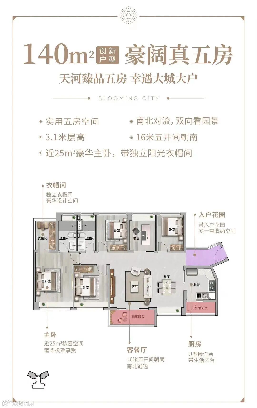 建面约140㎡宽境五房,总价约820万起。