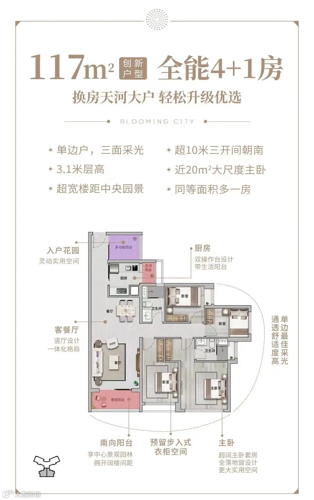 建面约117㎡南向4+1房,总价约630万起。
