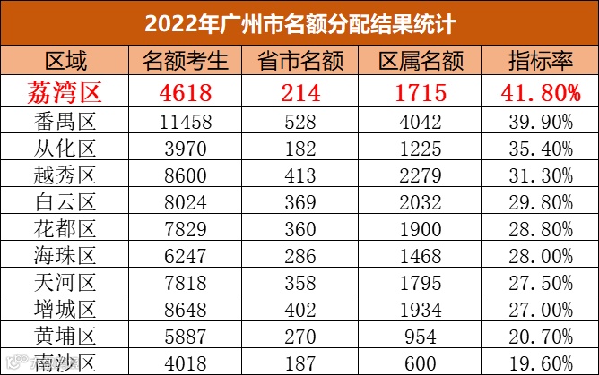 2022年指标率位居第一的是荔湾区,高达41.80%。即在荔湾区大概每100位孩子中,就有41个孩子靠名额分配就能上好高中。
