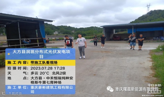2023年7月28日至29日,重庆豪彬建筑工程有限公司工程部总经理冉军和工程部杨秋、刘航和张俊豪等一行到贵州省毕节市大方县与施工队进行项目踏勘。对厂房屋顶现状(包括屋顶上的结构,屋面形式有了详细了解),踏勘了现场安装光伏发电项目所具备的条件和需要准备的相关事宜。大方县润邕分布式光伏发电项目用于建设太阳能光伏电站的建筑共计19家养殖场,建设面积总建筑面积约60万平方米,后期以使用面积为准,可进行光伏项目建设,概算太阳能电池组件安装容量可达130MW。
