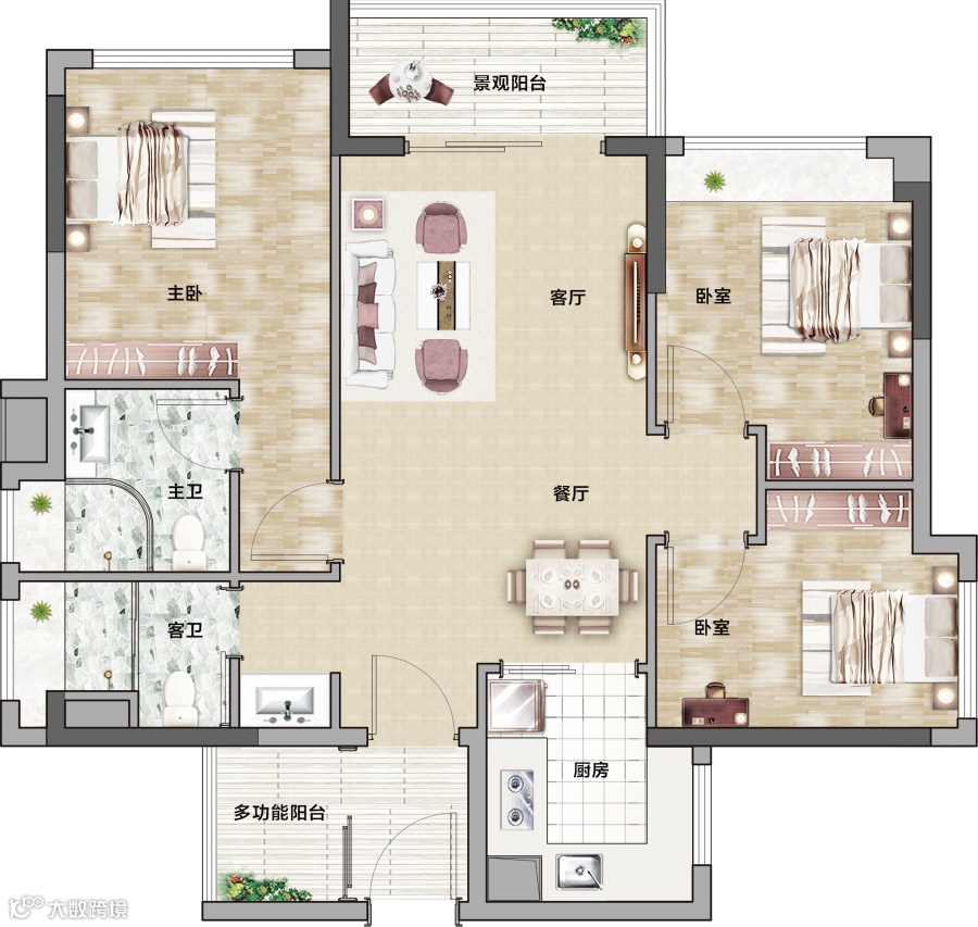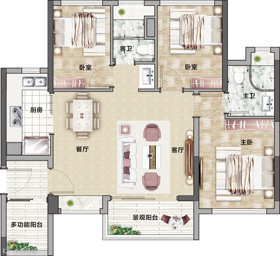 首先,是以更小面积做到三房尺度,面积够小、总价可控。