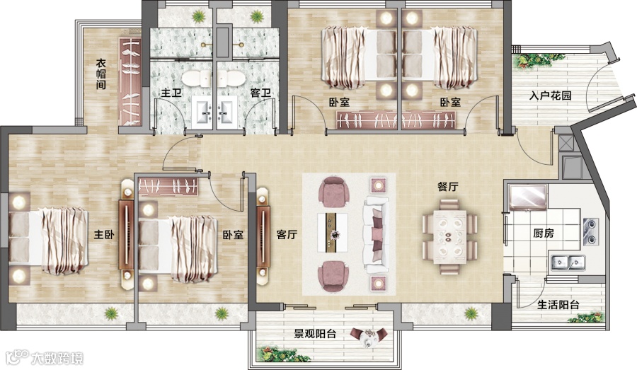 而建面约143m²五房户型,三阳台设计,主卧就达约30m²,这般空间布局市面不多见。