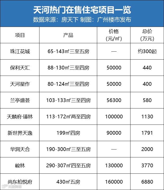 如下表所示,天河在售的热门一手楼总价多在400万起步,相比来看,珠江花城将要新推的65平三房是为数不多符合条件的。