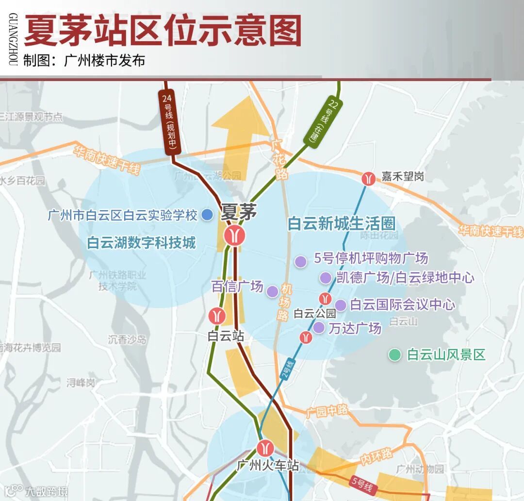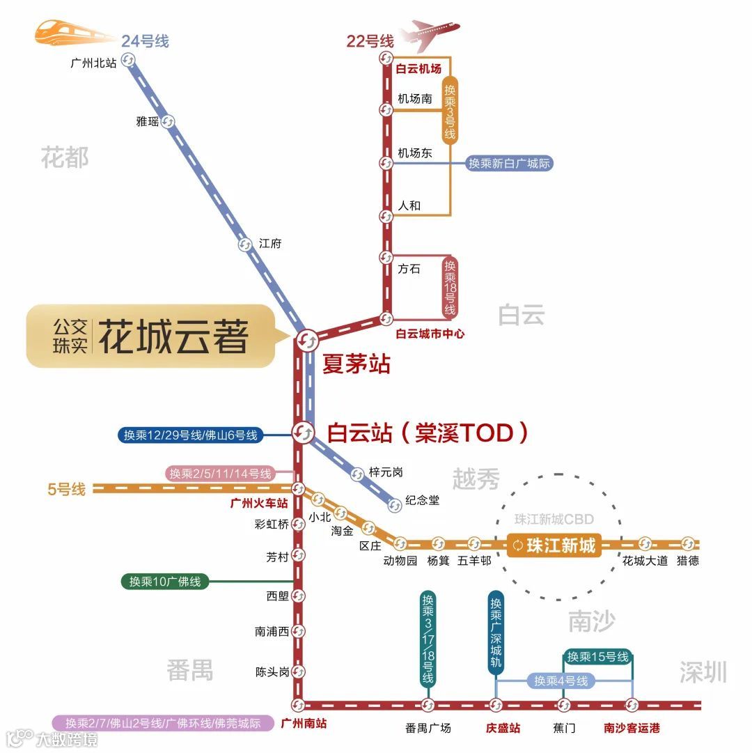 未来业主乘坐22号线1站到白云新城旁(棠溪TOD),2站通越秀(广州火车站),3站直达荔湾(彩虹桥站),到珠江新城也就一个新闻联播的时间。
