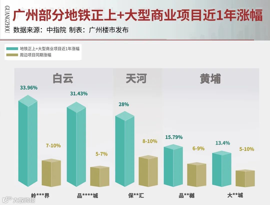 据中指院统计,白云、天河、黄埔同时兼具地铁正上+大型商业的项目近1年最高涨幅约34%,狂甩周边项目几条街。